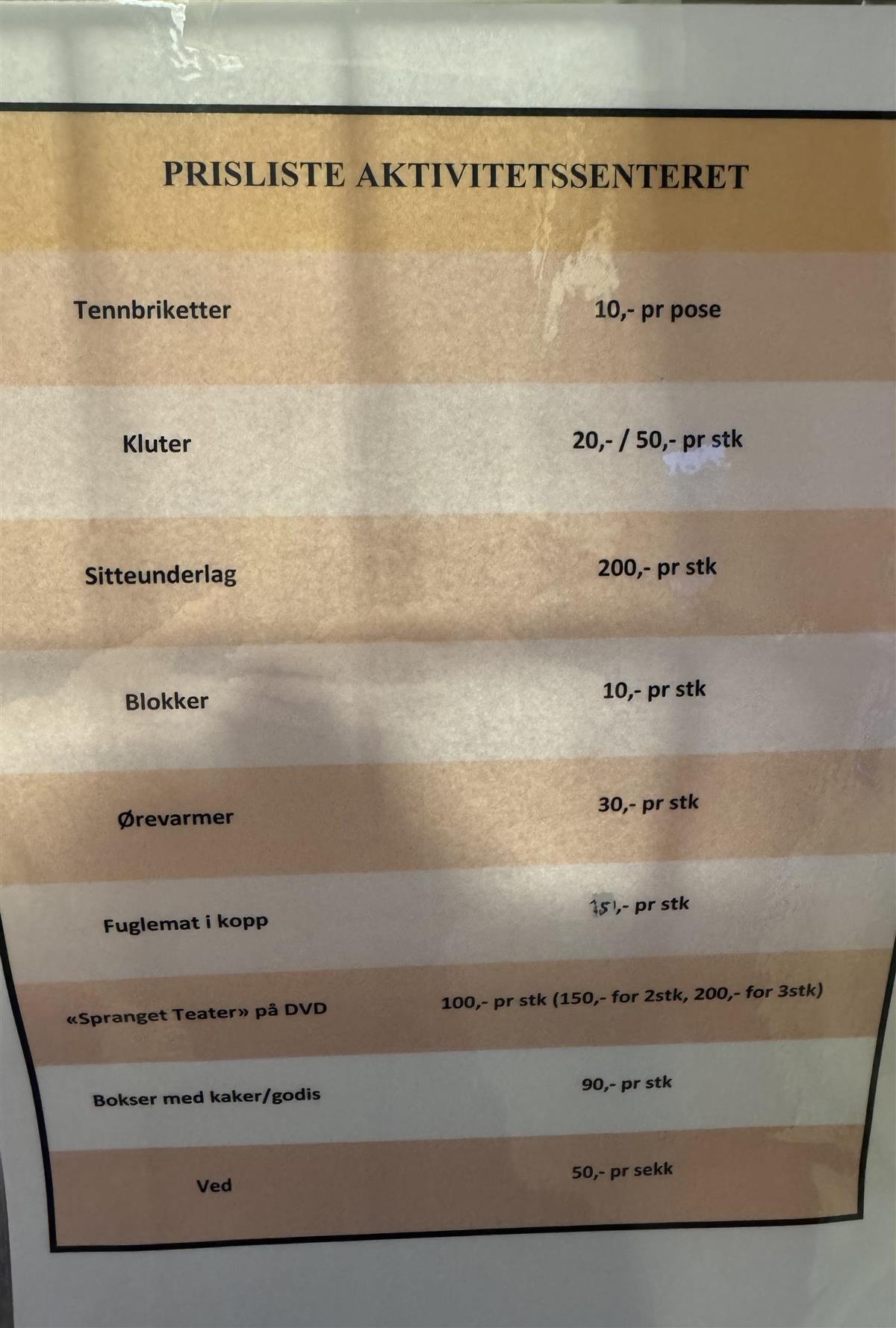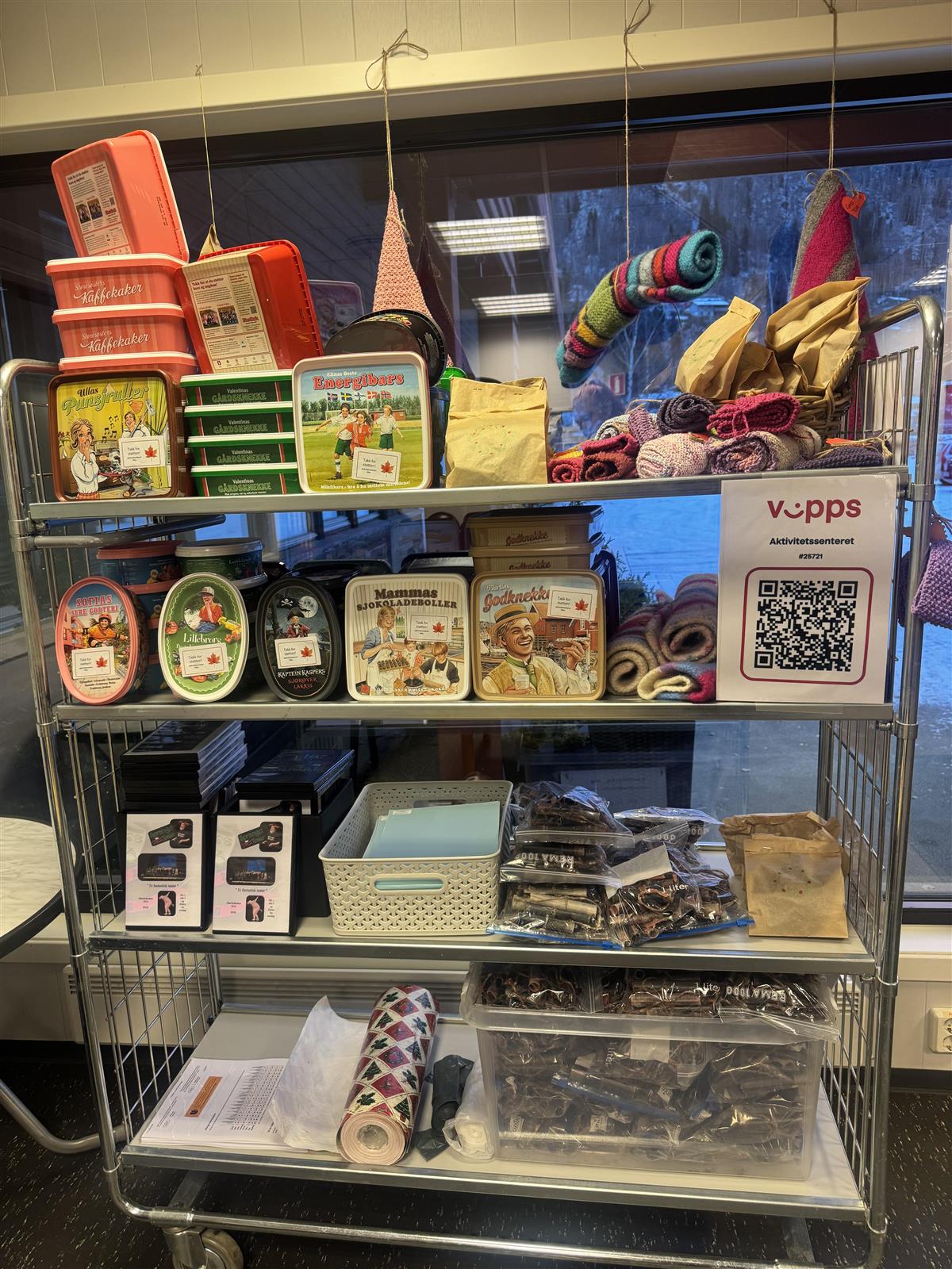 Vi har en liten butikk inne på Aktivitetssenteret der vi selger mye fint. Vi har blant annet fuglemat i søte kopper, sitteunderlag, ørevarmere, tennbriketter, ved og bokser med kaker/godis som er fint å kjøpe seg nå til jul.